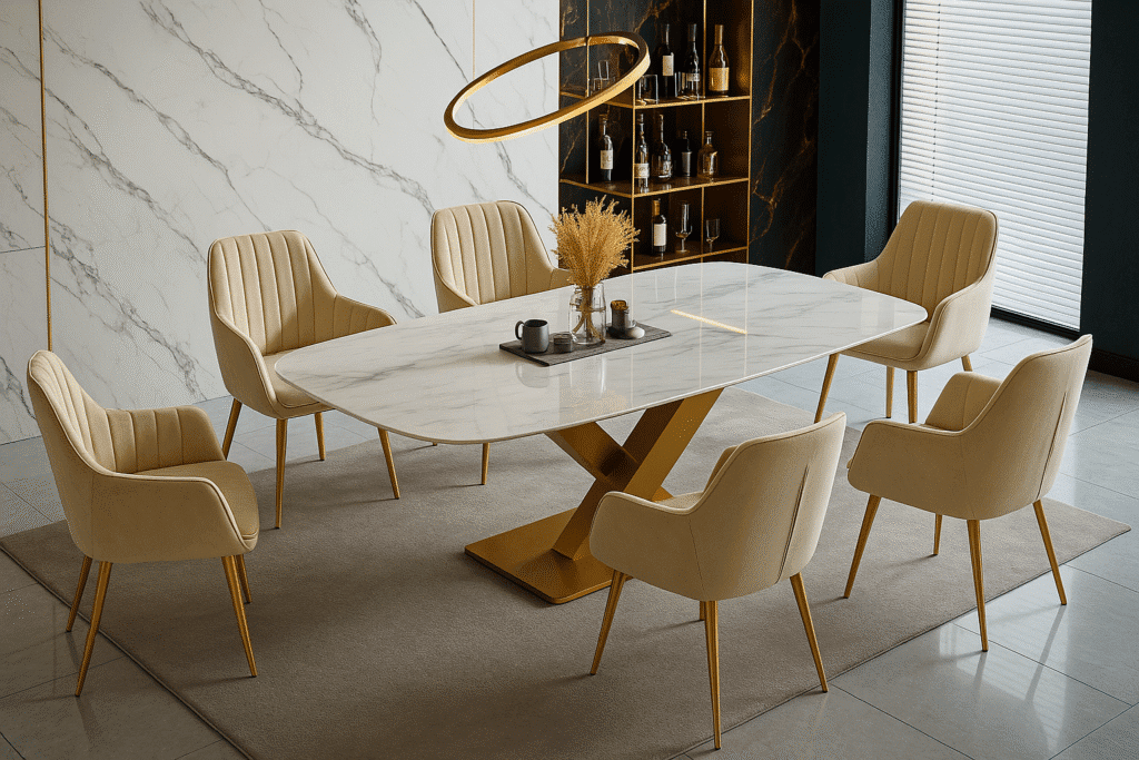 Chairs: Soft velvet upholstery with gold-tipped legs for a luxe finish