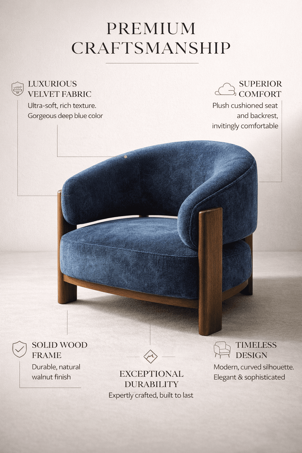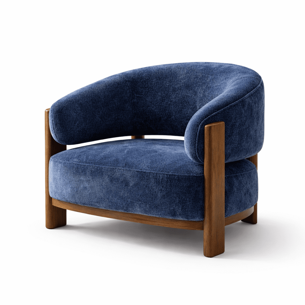 Its plush upholstered seat offers superior comfort, while the solid wooden legs introduce warmth and durability to the design. The deep blue fabric adds depth and sophistication, making Prisma a striking accent piece for contemporary homes.