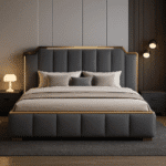- Striking Metallic Accents: Highlight the contrast and shine of the metallic frame surrounding the headboard.